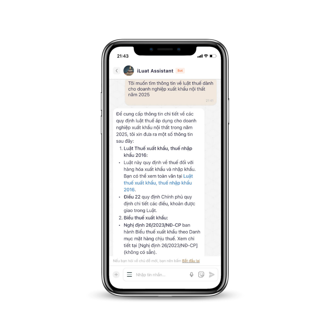 Hỏi đáp ngay với Chat Bot được huấn luyện từ trung tâm dữ liệu gần 300 bộ luật, 5.000 nghị định và 15.000 thông tư được cập nhật liên tục, mang lại câu trả lời chính xác, tiết kiệm thời gian tra cứu.